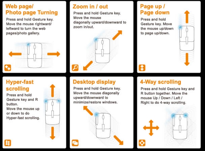 - 8個方向基本手勢功能, 一插即用, 無需安裝 (上/下頁, 放大/縮小, 桌面顯示/隱藏, 360度屏幕移動等)